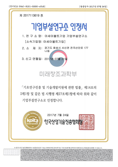 기업부설연구소 인정서 페이지 정보 작성자 아세아볼트 작성일18-01-04 00:19 조회1,840회 댓글0건 관련링크 이전글 다음글 목록 본문 기업부설연구소 인정서 이전글 다음글 목록