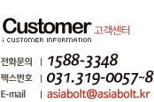 상호 : 아세아볼트  주소 : 경기도 화성시 서신면 전곡산단1길 29    TEL : 1588-3348 / FAX : 031) 319-0057~8 / Email : asiabolt@asiabolt.kr