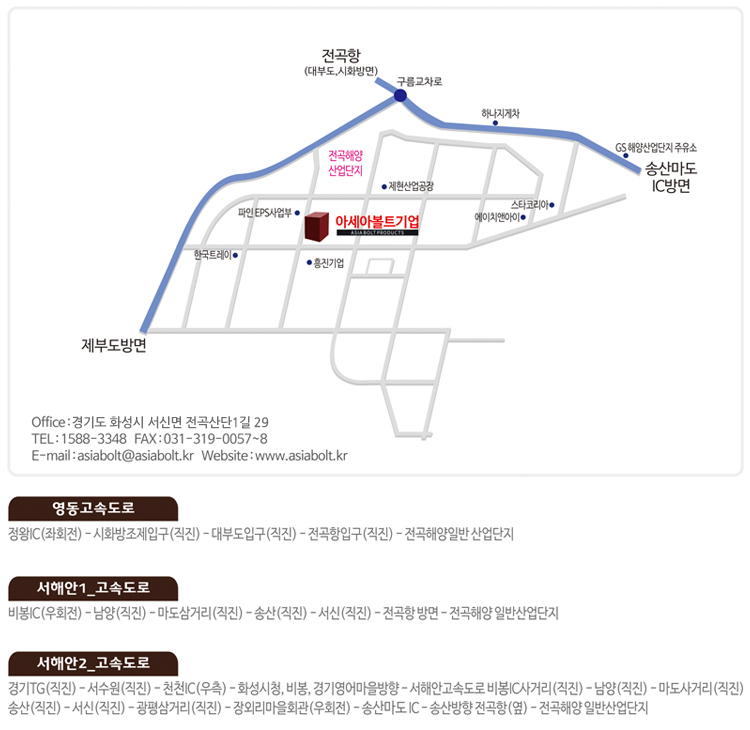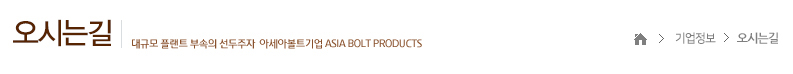 상호 : 아세아볼트  주소 : 경기도 화성시 서신면 전곡산단1길 29    TEL : 1588-3348 / FAX : 031) 319-0057~8 / Email : asiabolt@asiabolt.kr